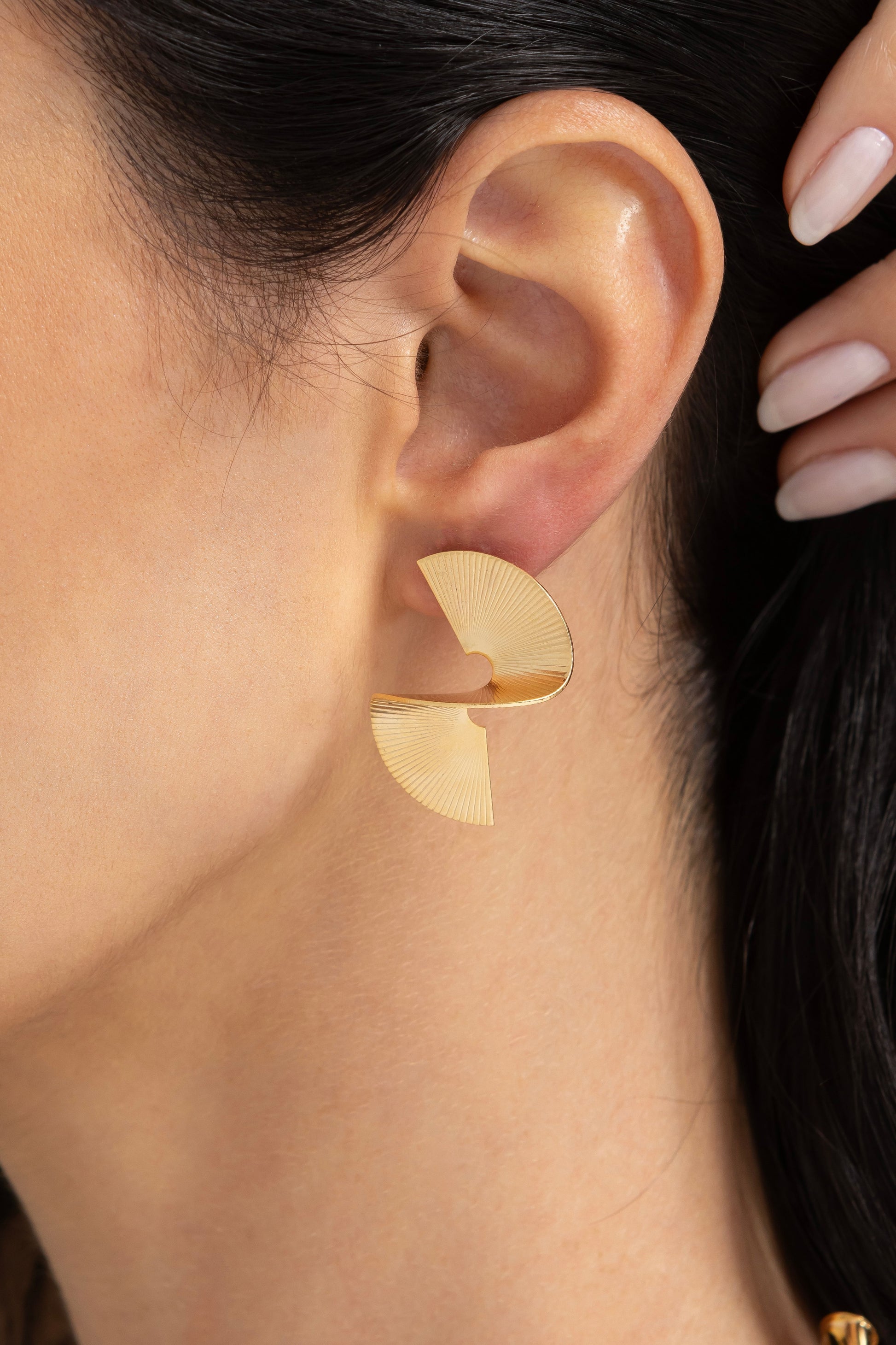 Goldie is designed to turn heads with its sculptural silhouette. Crafted in a fan-like cutout shape, these 18K gold-plated statement earrings create a modern architectural look that hugs the ear with effortless elegance.