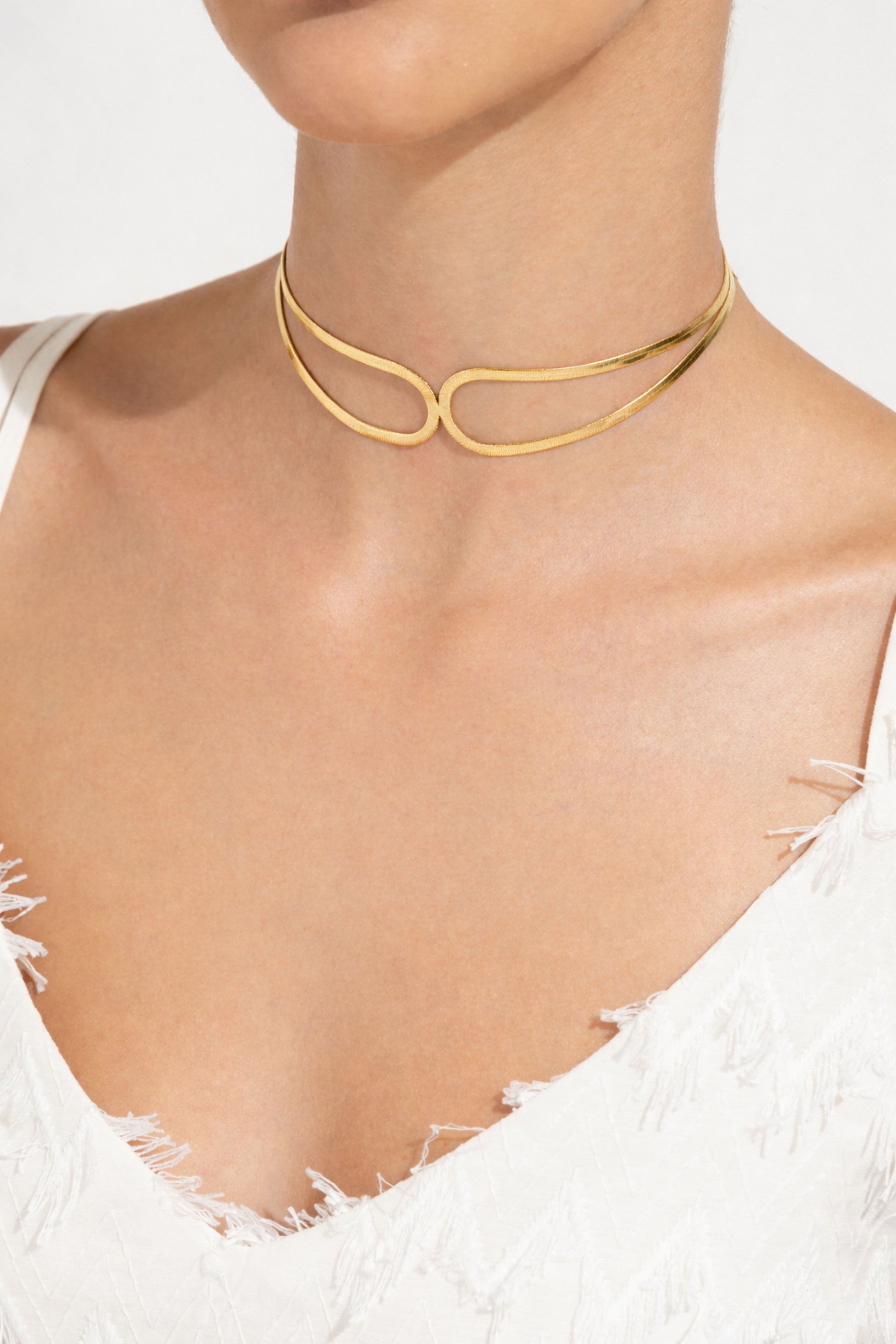 A sleek, sculpted choker with an infinity-inspired curve. Minimal yet striking, designed to sit perfectly on the neckline and elevate both everyday looks and evening edits.