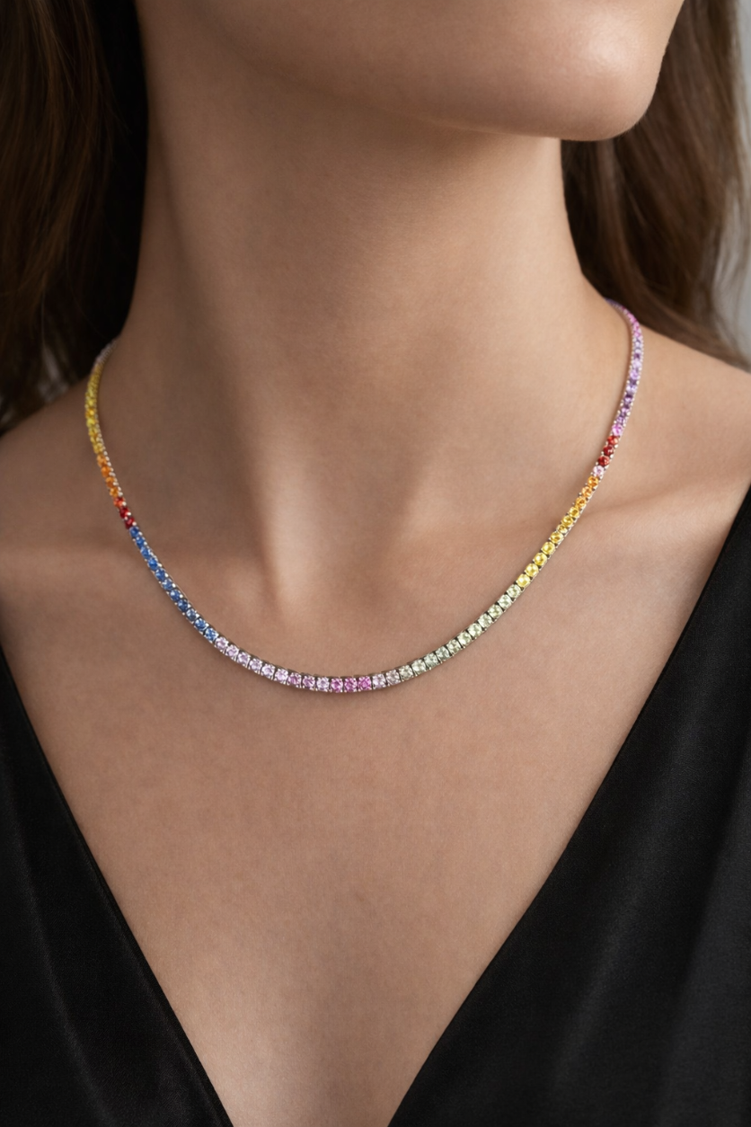 Make a colorful statement with the Shade Parade—a sleek line of sparkle crafted to stand out. Made from top-notch brass and coated in rhodium for added shine, it features exquisite 2mm zircon stones, each placed by hand for a seamless flow of color. At 43cm in length, every gem is securely locked at four points, ensuring a flawless fit and comfortable wear from day to night.