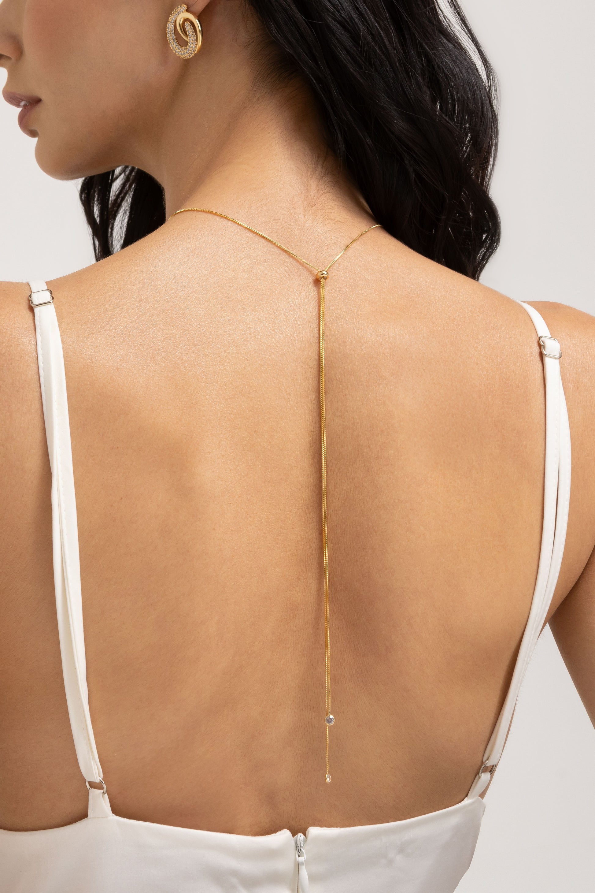 One necklace, two ways to shine! Slide Back is designed with a sleek drop detail that can be styled at the front for a bold statement, or flipped to the back for a dramatic open back look. Minimal, versatile, and endlessly chic, it’s the piece that adapts to your outfit.