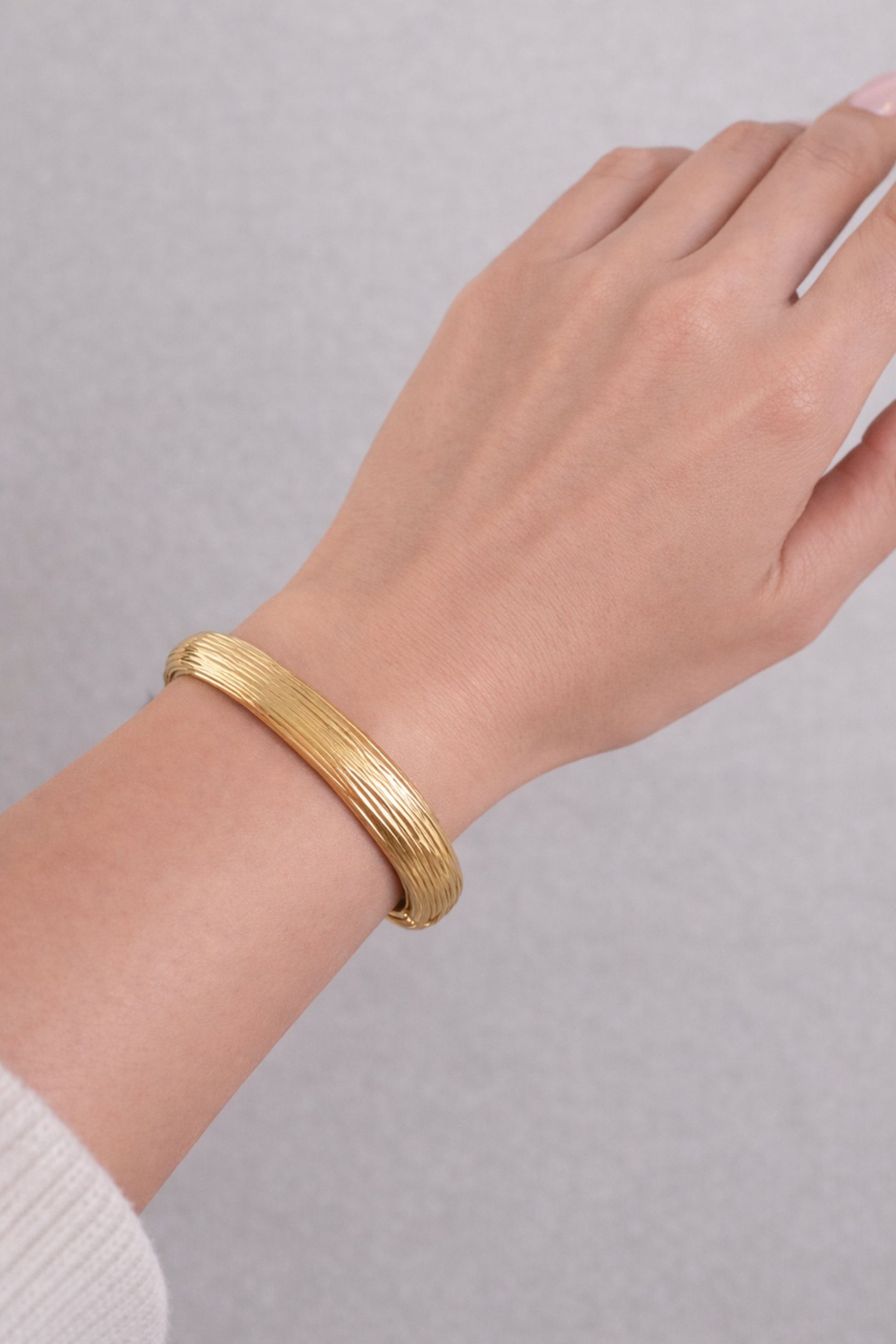 Sunstroke is your go-to for effortless shine. This gold plated bracelet features a unique textured surface that catches the light with every move. Available in both gold and silver finishes, let your wrist do the glowing.