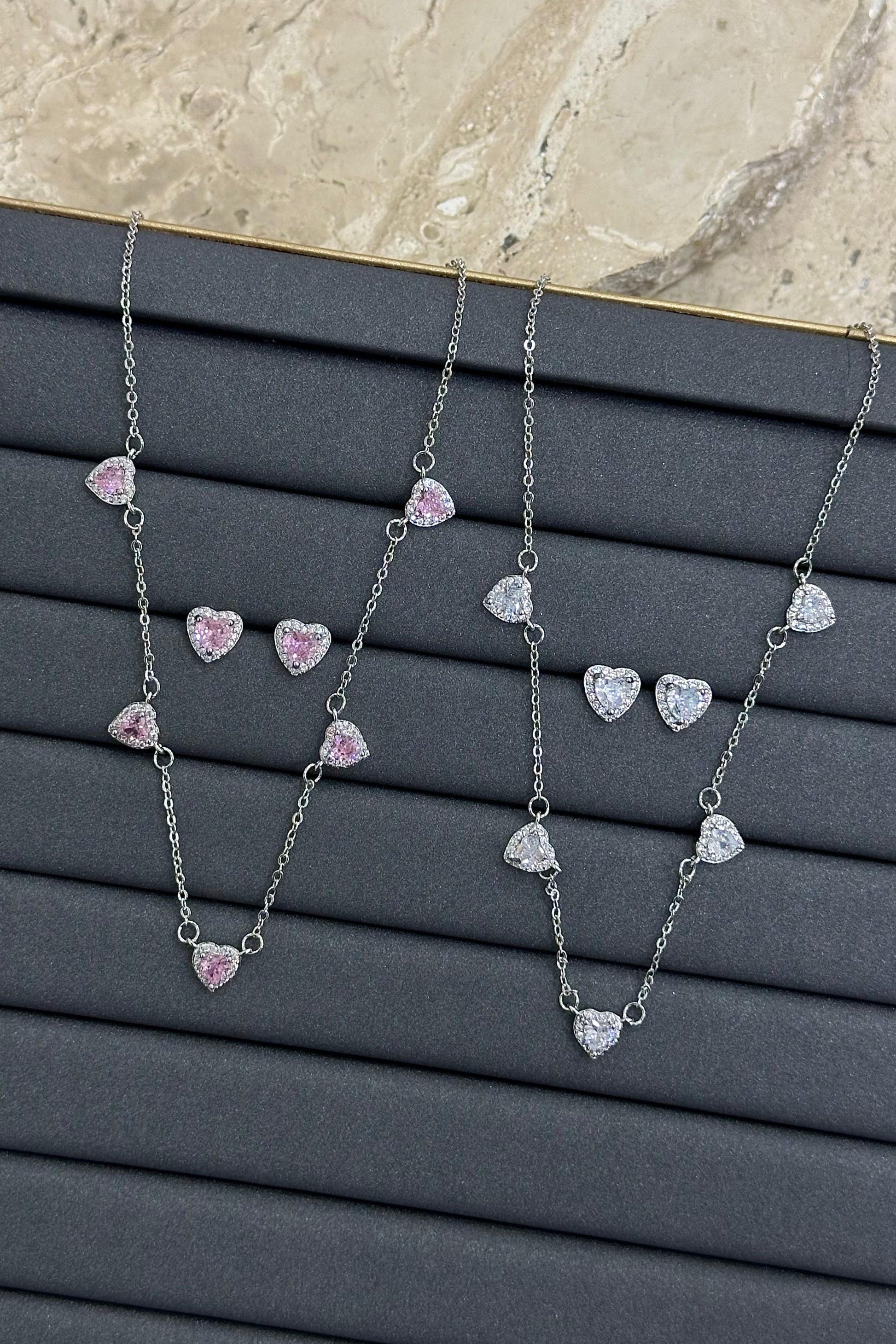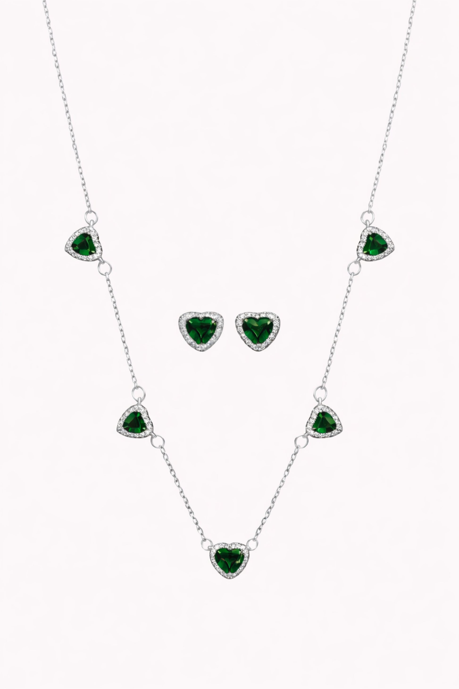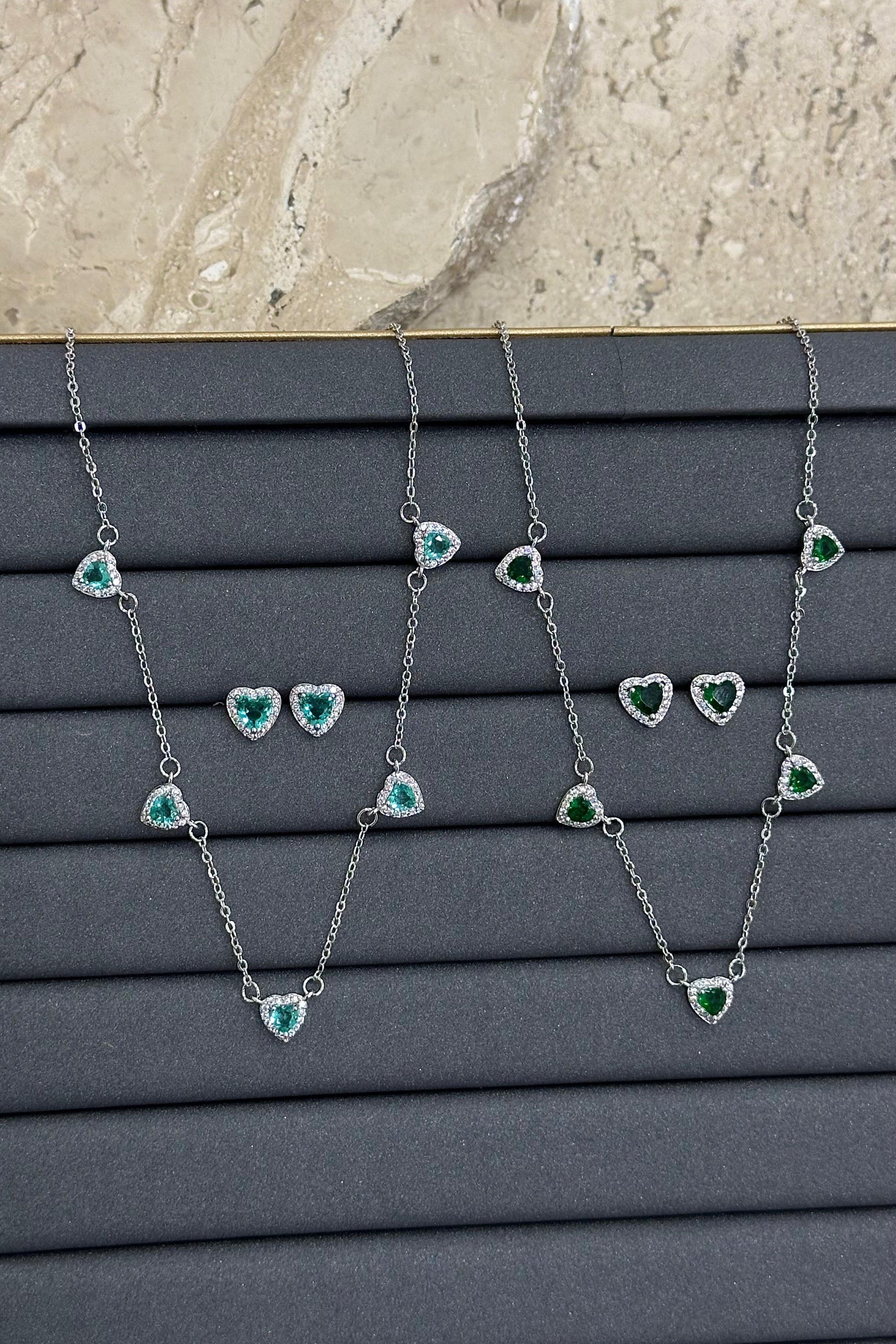 The Sweet Heart Set brings a soft, elegant glow to every look. Featuring a delicate heart-shaped necklace paired with matching stud earrings, each piece is crafted to sparkle with every movement. Available in three timeless shades, white, blue and green.