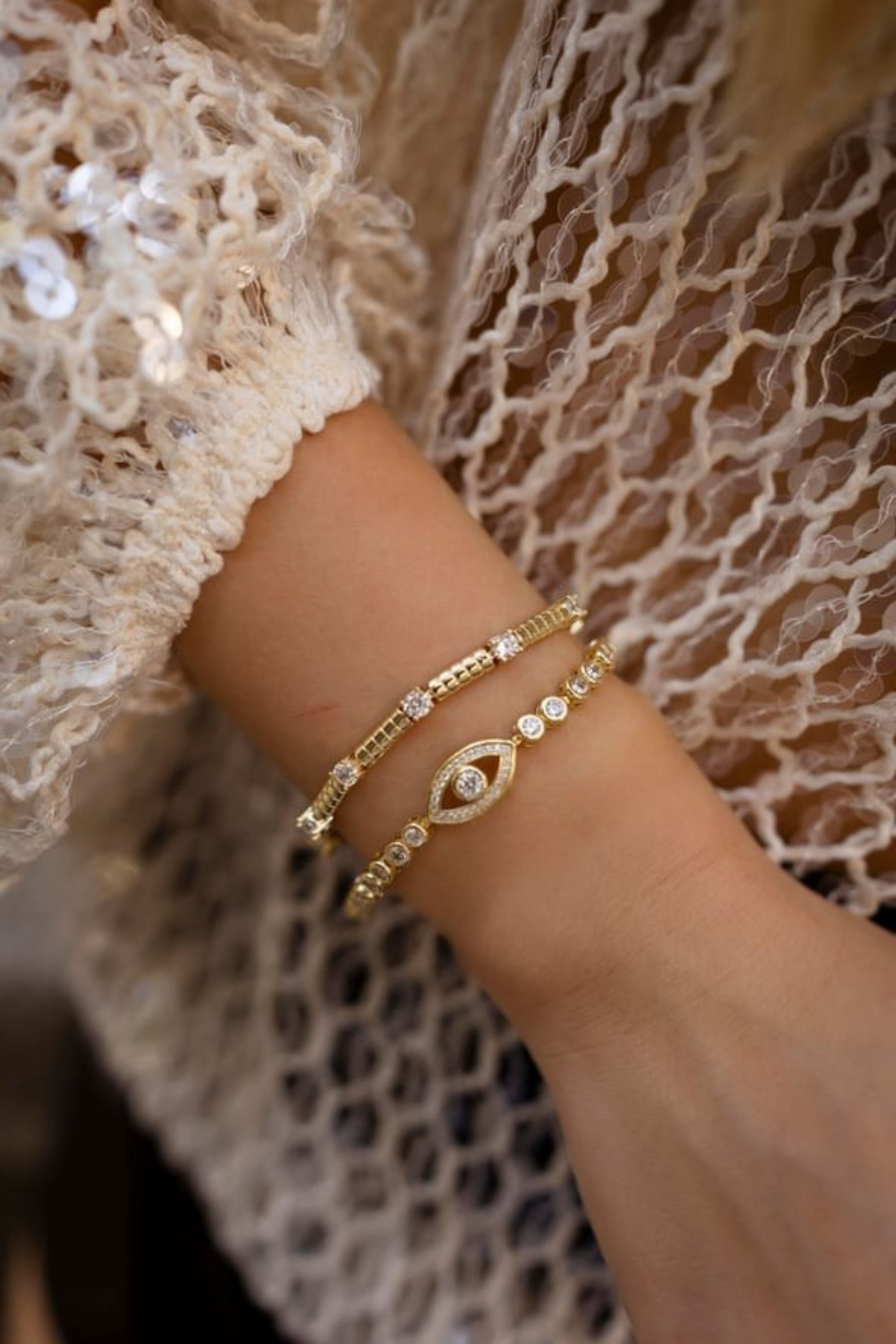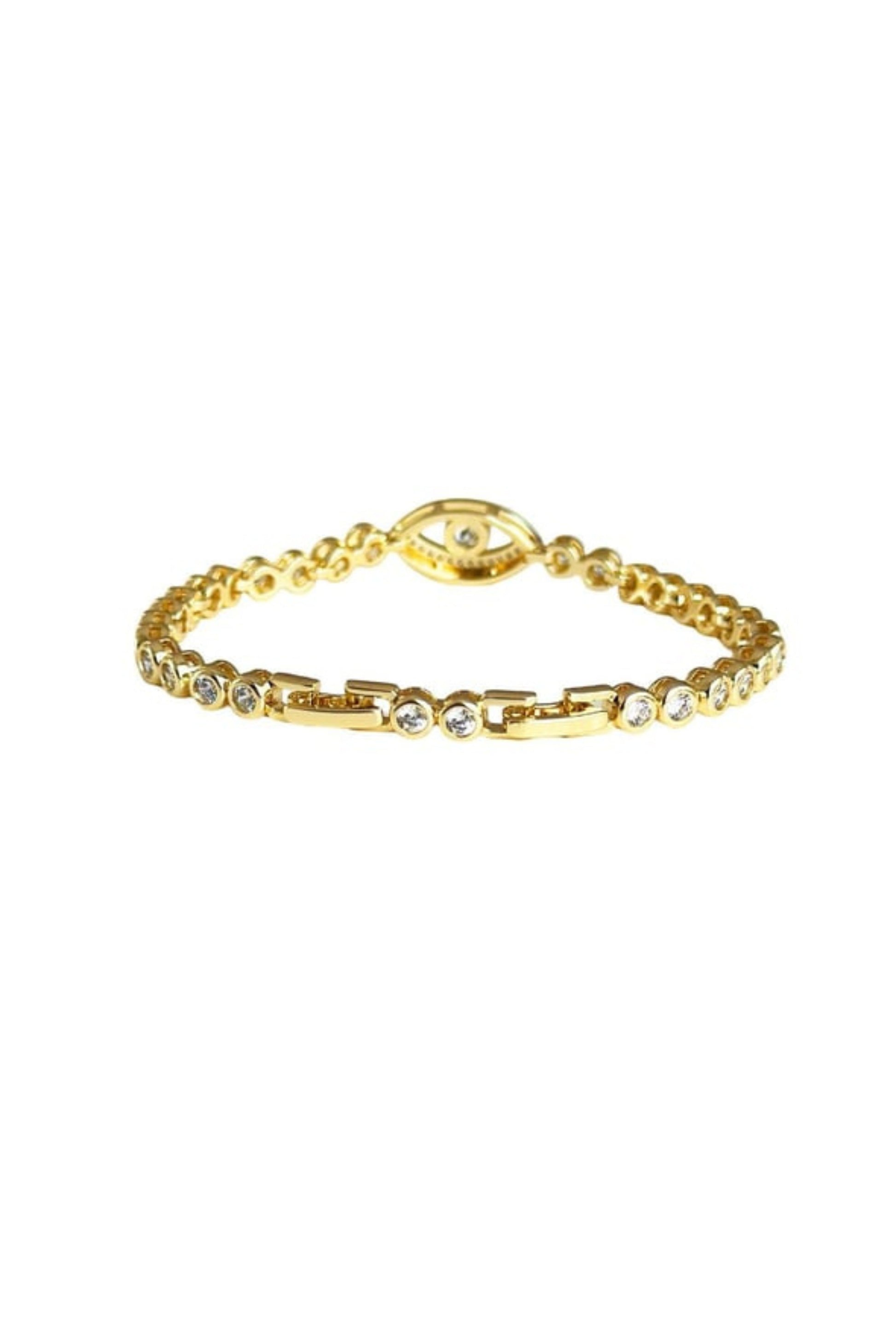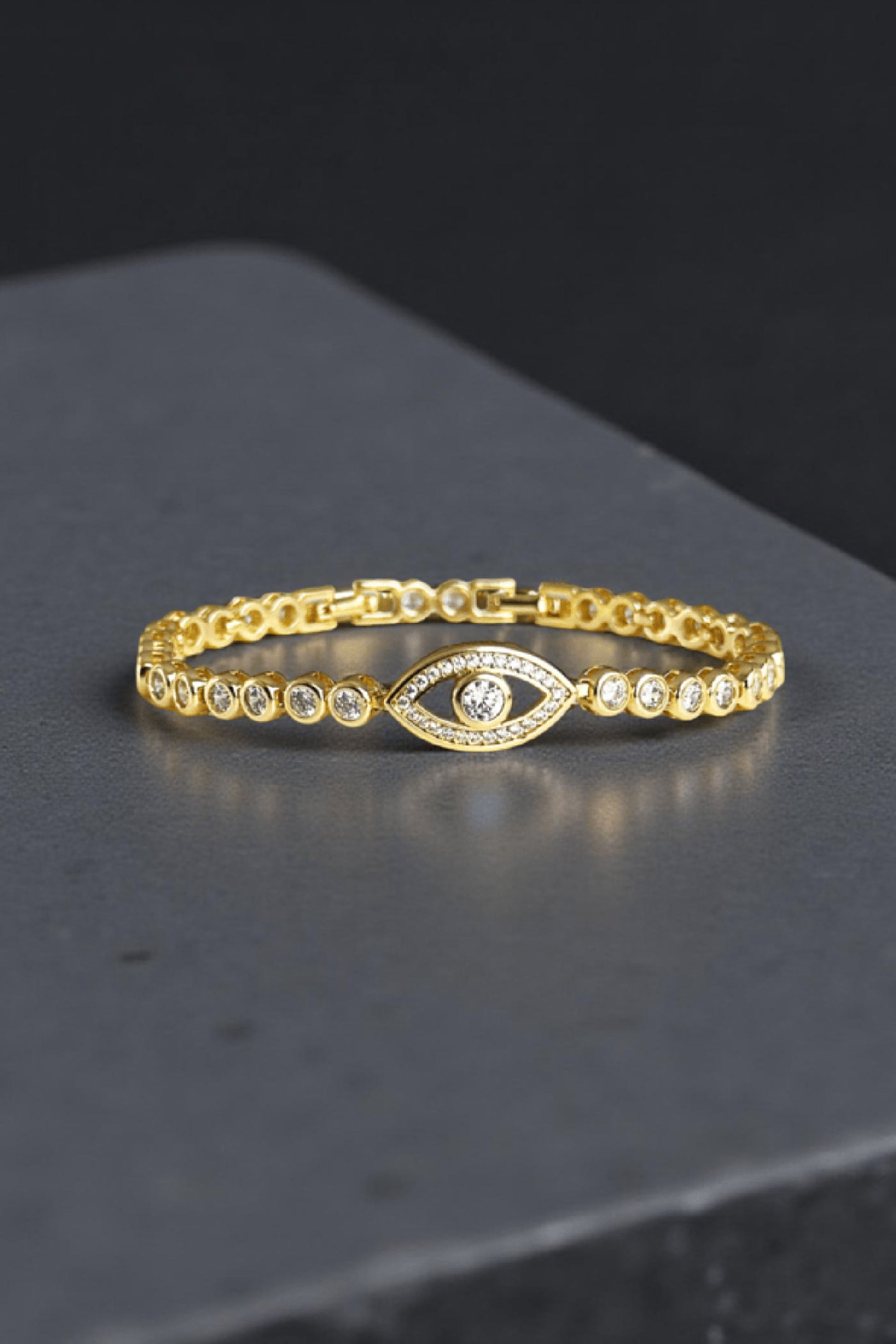 Watch Me features a striking evil-eye centerpiece surrounded by shimmering zircon stones on a sleek gold-plated chain.